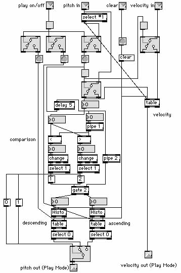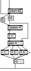 The first program was written to simply implement these rewrite rules. The program was written in such a way that it needed a starting note (any note contained in the raga). The starting note would then be detected and sent to a section in the program such as the one below (illustration#5). The starting note then randomly triggers the next note from a group of possible notes based on the above rewrite rules. The new note would then be in the position of the starting note and trigger a new note, and so on, ad infinitum, until the program is stopped.