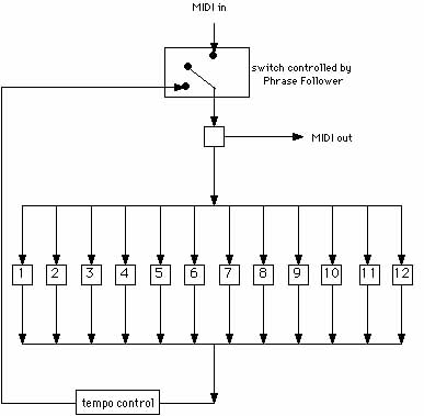 For a more detailed understanding of how the RagaPatch works we need to see how the MIDI pitch information passes through the program. In illustration #6 there are a series of boxes, numbered 1 through 12. Each box responds to a pitch-class (1= C, 2= C#, etc.). Each box contains the rewrite rules needed to produce an output note (as in illustration #5). For example, the incoming pitch, MIDI note 60 (middle C), will activate box #1, which will then trigger the next pitch to be played. The next pitch, say MIDI note 62 (D above middle C) and its velocity will simultaneously output a new pitch, say MIDI note 59 (B below middle C) and will activate box #12, which is now ready to output the next new pitch, and so on.