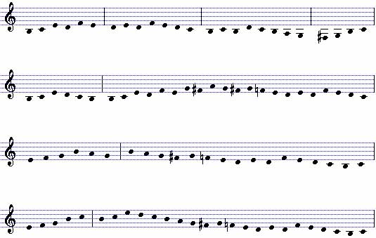 On analysis of the above melodic patterns, one begins to realize that the rules of melodic motion which they illustrate could be restated as possibilities or restrictions of movement from the perspective of each note. For example, if one starts with the note G, one sees from the above that the G may move to B, A, F#, and F. Not all notes have as much freedom of movement; F#, as seen above, can only move to G.
